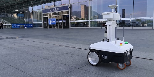 火車站巡視機器人配備溫度感應、人臉識別等功能,對在紅外線5米以內通過的人的體溫進行測量,識別來往人員是否戴口罩,遇上忘記戴口罩的人員,機器人馬上發出提示音,實現了現場實時播報。