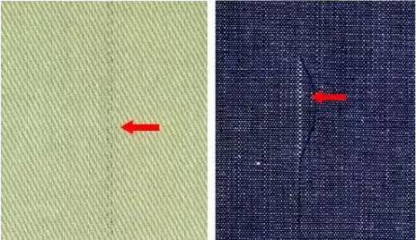 經(jīng)向疵點(diǎn):布面上由經(jīng)紗形成或沿經(jīng)紗方向形成的疵點(diǎn)。如缺經(jīng)、斷經(jīng)、粗經(jīng)、筘痕、雙經(jīng)、穿錯、吊經(jīng)、松經(jīng)等。